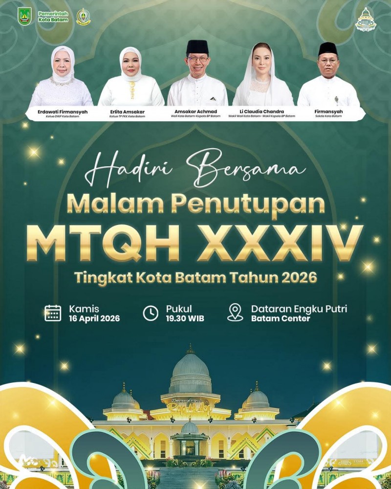BATAM – Pemerintah Kota (Pemko) Batam mengajak seluruh masyarakat untuk turut menyemarakkan malam penutupan Musabaqah Tilawatil Qur’an dan Hadits (MTQH) XXXIV Tingkat Kota Batam Tahun 2026. Kegiatan penutupan ini dijadwalkan berlangsung pada Kamis, 16 April 2026, bertempat di Dataran Engku Putri, mulai pukul 19.30 WIB hingga selesai.